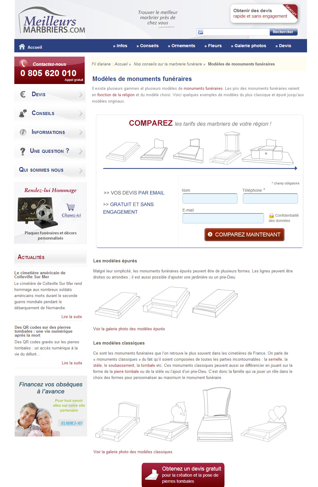 Le site Meilleurs-Marbriers.com permet de comparer les marbriers funéraires en France, offrant des services de création et de pose de monuments funéraires, tombes, caveaux et columbariums. Il propose des devis personnalisés et des informations pratiques sur les matériaux (granit, marbre), les prix, et l’entretien des monuments.